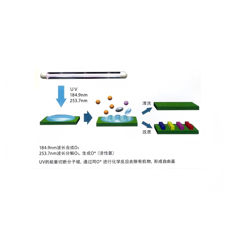 The working principle of UV cleaning technology: This method utilizes the photo-oxidation of organic compounds to remove adhered organic substances from material surfaces, achieving “atomic-level cleanliness” through photolithography. Specifically, UV light sources emit photons at 185nm and 254nm wavelengths, which carry high energy. When these photons strike the surface of materials to be cleaned, most hydrocarbons absorb the 185nm UV light with remarkable efficiency. The absorbed energy then decomposes into ions, free atoms, excited molecules, and neutrons – a process known as photo-oxidation. Simultaneously, oxygen molecules in the air absorb 185nm UV light and generate ozone and atomic oxygen. Ozone exhibits strong absorption of 254nm UV light and further breaks down into atomic oxygen and oxygen gas. The highly reactive atomic oxygen facilitates the decomposition of carbon and hydrocarbon residues on surfaces, converting them into volatile gases like carbon dioxide and water vapor that escape from the material surface. This mechanism thoroughly eliminates carbon and organic contaminants adhering to the material’s surface.